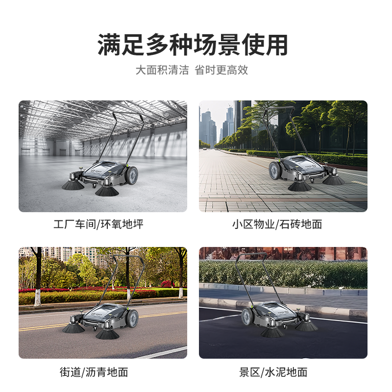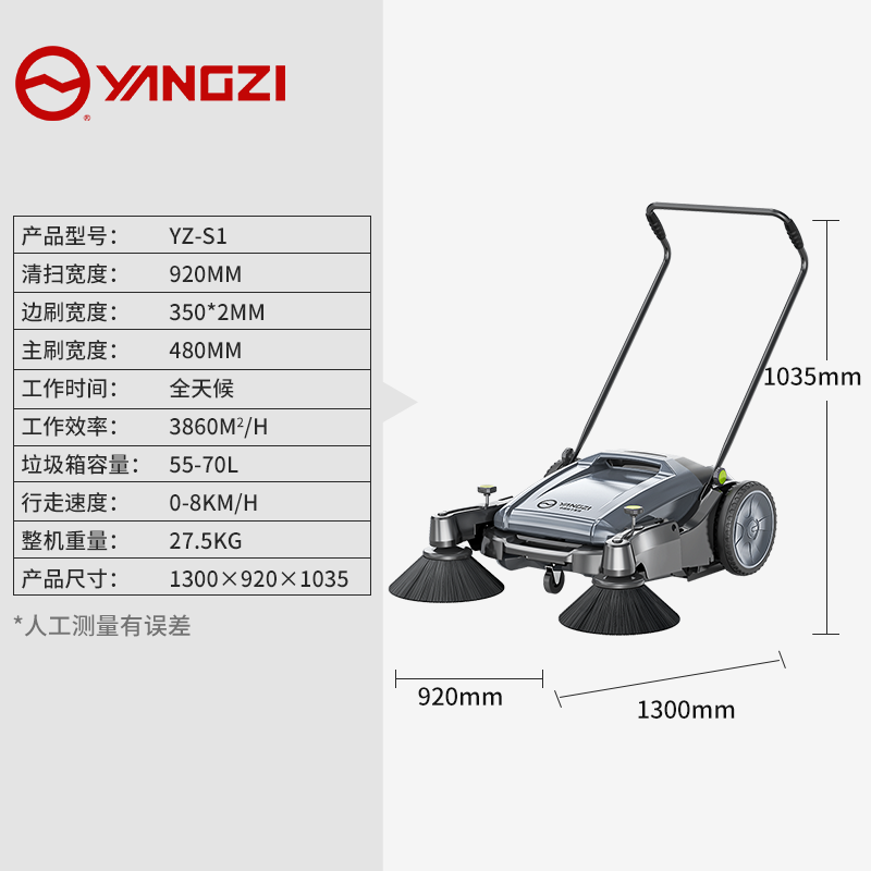 揚子YZ-S1手推式掃地機主要依靠滾刷、邊刷來完成清掃工作,結構相對簡單,操作方便快捷, 整機不需要任何電動助力,不用油、不用電,只需步行推動就能把垃圾輕松回收到垃圾箱,可以清掃