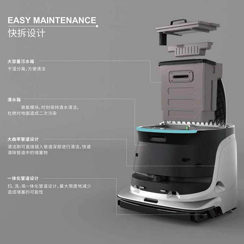 功能強大,掃地、吸塵、洗地、塵推、消毒、自清潔六大清潔工序,高度700mm,高度僅550mm,極致貼邊邊界自動識別,進口靜音材質噪音低質55db